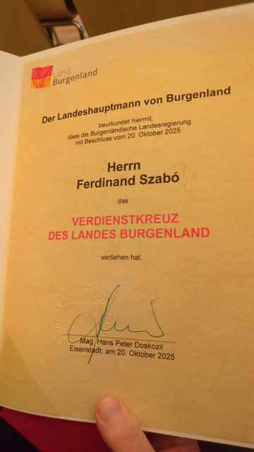 A Nem Hivatásos Színjátszás Burgenlandi Tartományi Szövetségének második közgyűlése alkalmából kitüntetést kaptam az Alsóőri Kétnyelvű Színjátszóegyesület És Kultúrkörben végzett sokéves tevékenységemért.