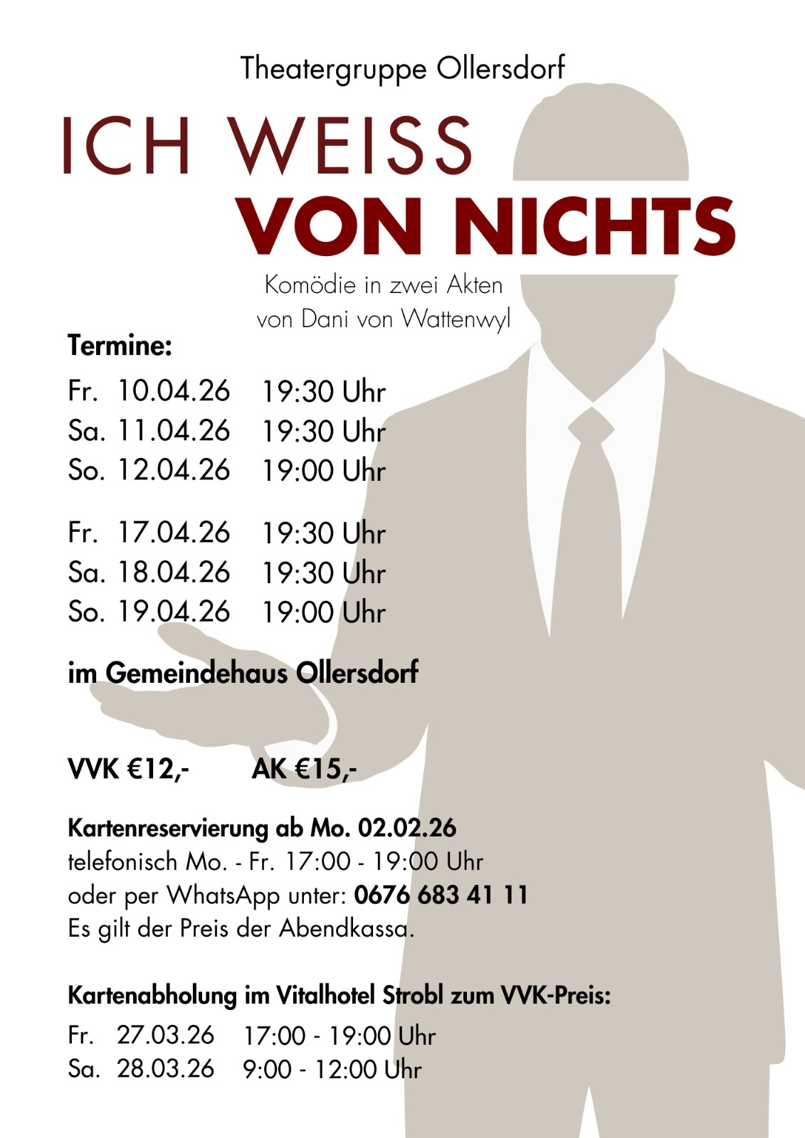 | Ollersdorf Tel.+436766834111 | 10.4.2026, 19:30 Uhr, !Ichweiß von nichts" | 11.4.2026, 19:30 Uhr | 12.4.2026, 19:00 Uhr | 17.4.2026, 19:30 Uhr | 18.4.2026, 19:30 Uhr | 19.4.2026, 19:00 Uhr |