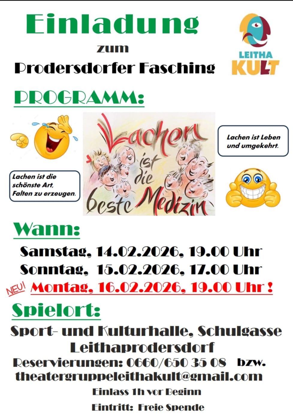 | Leithaprodersdorf Tel+436606503508 | 14.2.2026, 19:00 Uhr Prodersdorfer Fasching | 15.2.2026, 17:00 Uhr | 16.2.2026, 19:00 Uhr | |||
