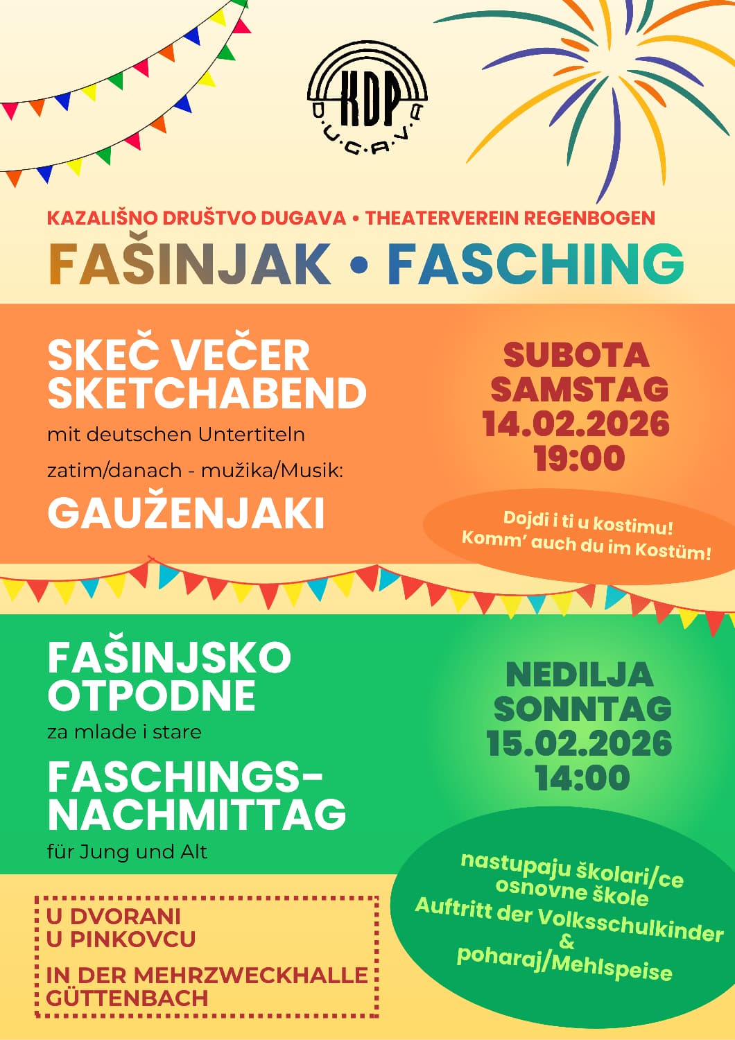 | Güttenbach Tel +436643665939 | 14.2.2026 "Sketch Abend" 19:00 Uhr | 15.2.2026 "Faschingsnachmittag" 14:00 Uhr | ||||