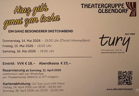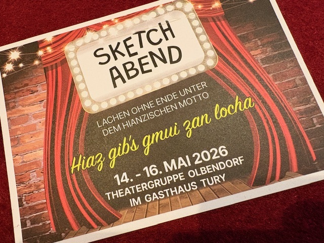 | Olbendorf Tel.+436641111477 | 14.5.2026 Sketch Abend, 19:00 Uhr | 15.5.2026, 19:00 Uhr | 16.5.2026, 19:00 Uhr | |||