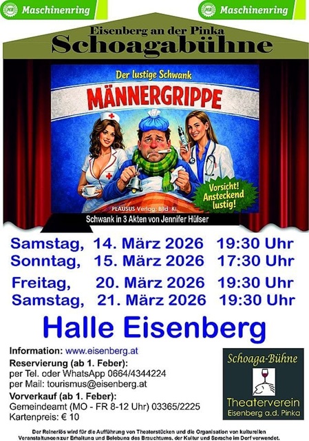 | Eisenberg Tel +436643930683 | 14.3.2026, 19:30 Uhr "Männergrippe" | 15.3.2026, 17:30 Uhr | 20.3.2026, 19:30 Uhr | 21.3.2026 19:30 Uhr | ||